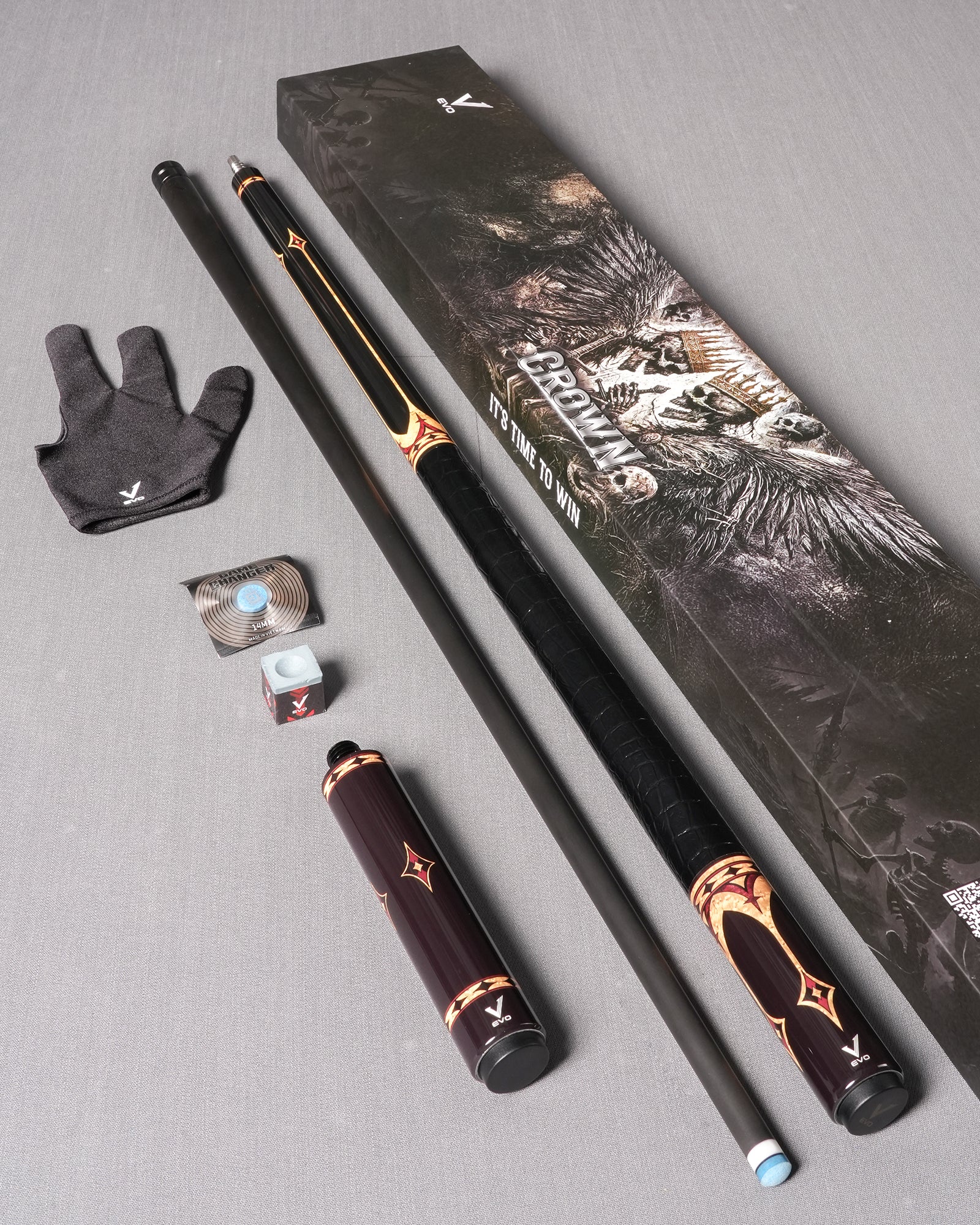 Complete player kit that includes a premium playing cue, extension, tip, glove, and chalk — everything you need to elevate your game.